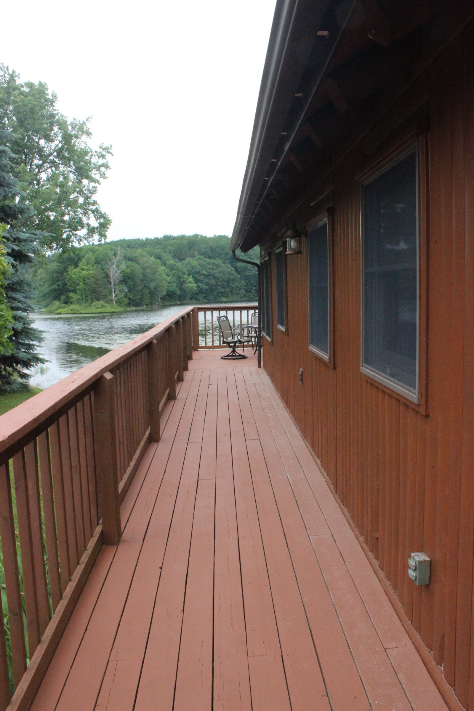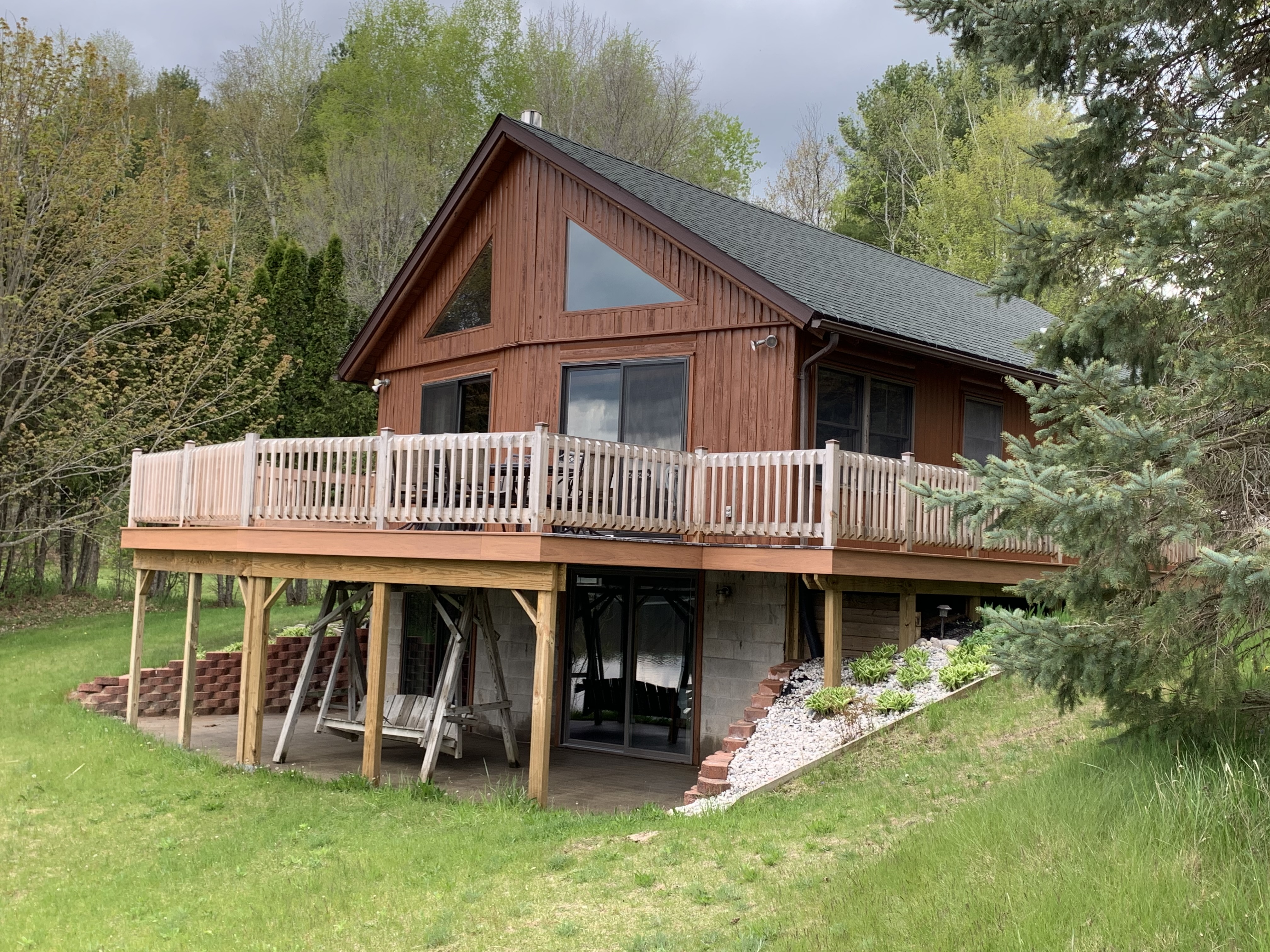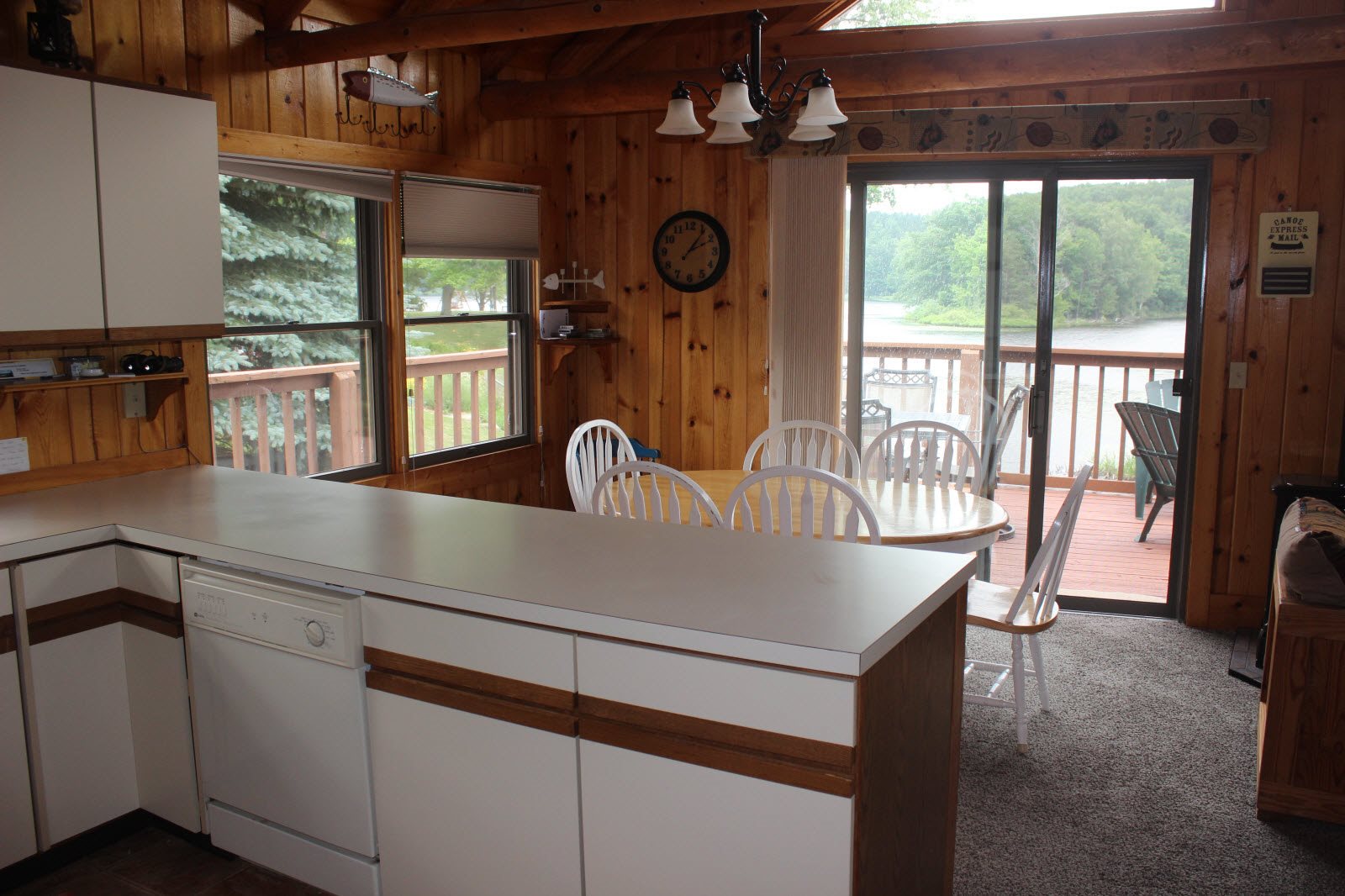 A large deck wraps around two sides of the cottage and gives you a very nice lake views. A cement patio out-side the walkout level has a swing on it where you can also sit and enjoy the peaceful views of the lake and your surroundings. The kitchen area is large and fully equipped with everything you will need for your stay, including a dishwasher. The Michigan cottage is air-conditioned.