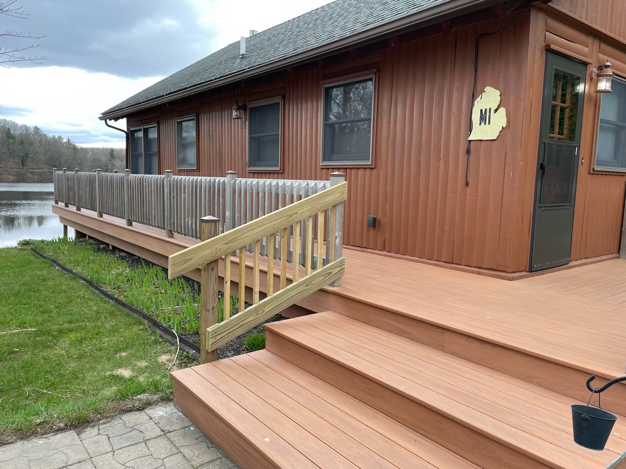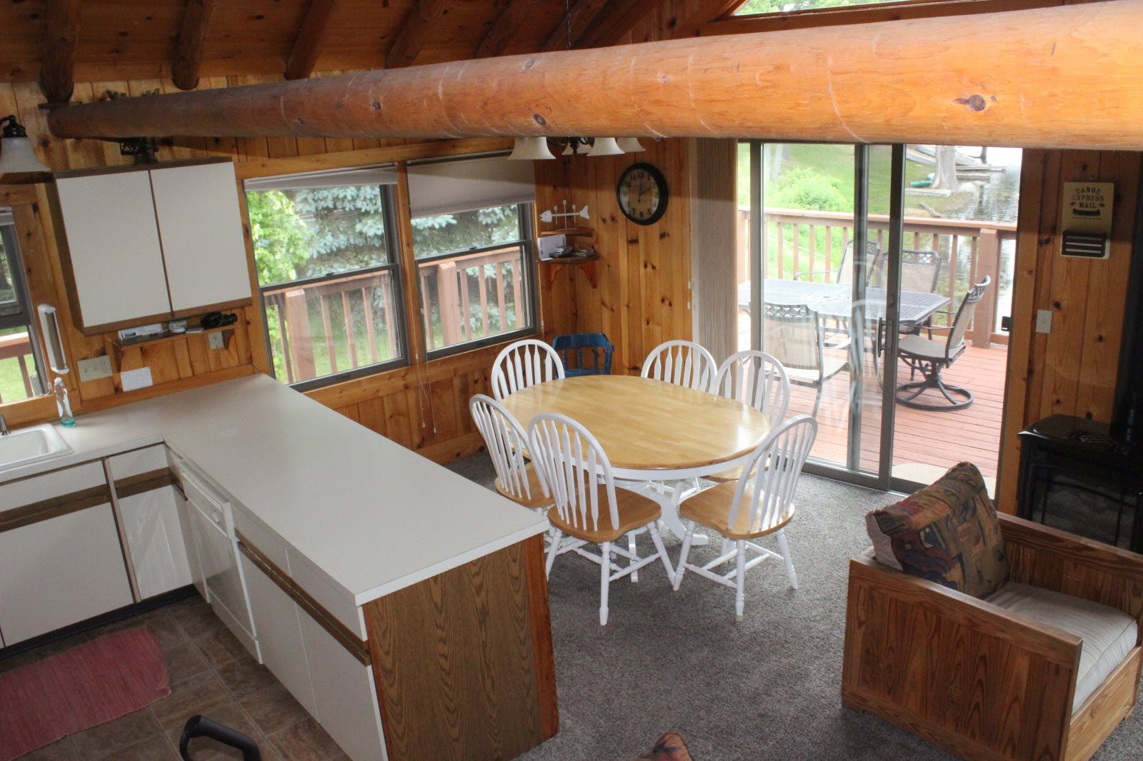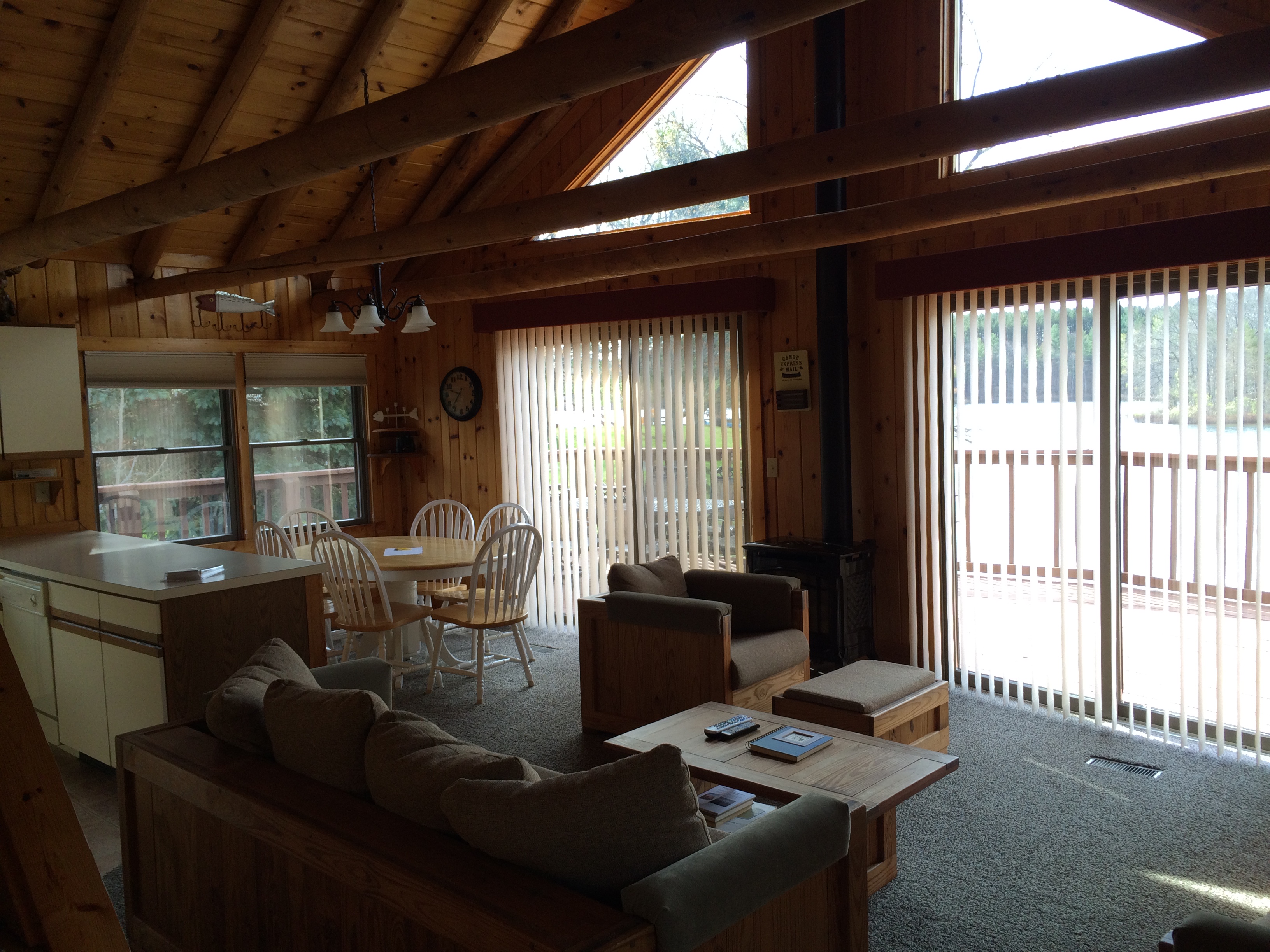 A large deck wraps around two sides of the cottage and gives you a very nice lake views. A cement patio out-side the walkout level has a swing on it where you can also sit and enjoy the peaceful views of the lake and your surroundings. The kitchen area is large and fully equipped with everything you will need for your stay, including a dishwasher. The Michigan cottage is air-conditioned.